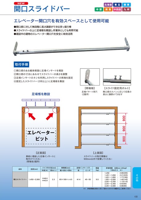 NEW開口スライドバー北海道東北関東中部関西中四国九州エレベーター開口穴を有効スペースとして使用可能●開口部に対して無段階に長さ調節ができる突っ張り棒●スライドバーの上に足場板を敷設し作業床としても利用可能●建設中の建物のエレベーター開口穴を安全に有効活用取付手順①開口部のある躯体側面に足場インサートを埋設②開口部の寸法にあわせてスライドバーの長さを調整③足場インサートのネジを利用しスライドバーの両端を固定④固定したスライドバー(2本以上)に足場板を敷設足場板を敷設【両端板】足場イサート用穴(2箇所)【スライド固定用ボルト】開口部のスパンに応じて任意の長さに調節ができます【正面図】事前に埋設した足場インサートに取付けてください(両端各2箇所)【上面図】スライドバーの取付間隔は900mm以内で設置してください品名全長(mm)パイプ外寸法(mm)外径(Φ)厚み(t)両端板(mm)幅×長さ×厚み足場インサート穴ピッチ径質量(kg)開口スライドバー1,450~2,500Φ48.6Φ42.82.365×190×t4.5Φ1445~559.5許容荷重全長mm:kN(kgf)1本あたり※11,450:2.89(295)1,451~1,650:2.21(225)1,651~1,850:1.77(180)1,851~2,050:1.42(145)2,051~2,250:1.13(115)2,251~2,450:0.93(95)2,451~2,500:0.88(90)※1許容荷重は長さに応じて変わりますので確認の上ご使用ください132