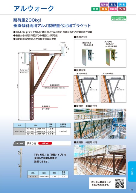 角丸バタ用・60角バタ用丸バタ用・50角バタ・φ48.6単管用120φ60.5642アルウォーク耐荷重200kg!垂直傾斜面用アルミ製軽量化足場ブラケット●1本4.3kg(フックなし)と錆に強いアルミ製で、多義にわたる設置方法が可能●垂直から約1割勾配までの斜面に対応可能●収納時は折りたたみが可能で保管に便利■専用フック北海道東北関東中部関西中四国九州NETIS登録商品KKK-170004-VE■設置方法角バタの場合丸バタの場合足場板固定穴※足場板は番線で固定してください1040角バタ:62丸バタ:52150角度調整穴0°~約45°■使用例垂直取付用品名型式アルウォークフックなし丸バタ用角バタ用AWBN-FNAAWBN-FCAAWBN-FSA質量(kg)4.3/本5.3/本5.4/本許容荷重kN(kgf)1.96(200)OPTION手すり柱NEW■使用例斜面取付用「手すり柱」と「単管パイプ」を使用して手摺も簡単に設置できます。品名型式規格手すり柱AWBN-T1.01.0M質量(kg)1.7取り扱い動画などがご覧いただけます。134