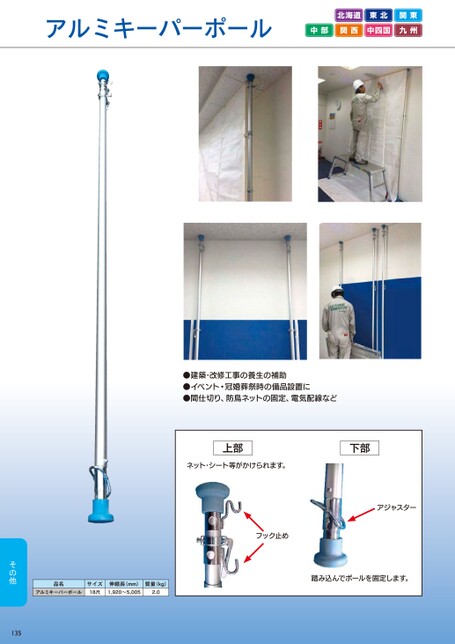 アルミキーパーポール北海道東北関東中部関西中四国九州●建築・改修工事の養生の補助●イベント・冠婚葬祭時の備品設置に●間仕切り、防鳥ネットの固定、電気配線など上部下部ネット・シート等がかけられます。アジャスターフック止め品名サイズ伸縮長(mm)質量(kg)アルミキーパーポール18尺1,920~5,0052.0踏み込んでポールを固定します。135