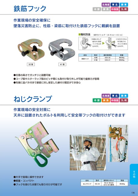 鉄筋フック北海道東北関東中部関西中四国九州作業現場の安全確保に墜落災害防止に、柱筋・梁筋に取付けた鉄筋フックに親綱を設置32型41型品名鉄筋フック型式32型41型適応鉄筋径D22-32D35-41質量約630g約920g●任意の高さでガッチリと設置可能●コープ筋やスターラップ筋のピッチ間にも取付け取り外しが可能で盛換えが容易●先端に皿バネ付きで鉄筋に対し安定した締付け固定ができ安心ねじクランプ北海道東北関東中部関西中四国九州作業現場の安全対策に天井に設置されたボルトを利用して安全帯フックの取付けができます●片手で容易に操作できます●軽量・コンパクト●フックを掛けた状態でも取り付けが可能です品名型式ねじクランプNC-43適用吊りボルト吋1/2・吋3/8M12・M10兼用質量約460g136