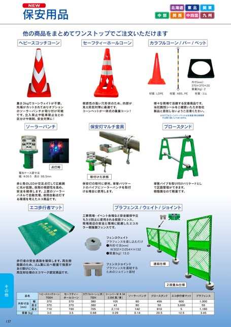 NEW保安用品北海道東北関東中部関西中四国九州他の商品をまとめてワンストップでご注文いただけますヘビースコッチコーンセーフティーホールコーンカラフルコーン/バー/ベット重さ3kgでコーンウェイトが不要。先端がカットされておりオプションのソーラーパンチが取り付け可能です。立入禁止や駐車禁止などの区分けや規制、安全対策に!視認性の高い穴形状のため、内部が見え防犯対策に最適です。コーンベットが一体式の重量コーン!外寸(mm):370×370×20質量(Kg):2材質:LDPE材質:ABS、PE材質:ゴム様々な現場で活躍する定番商品です。当社識別シールをご確認いただき他社製品と混在しないようご注意ください。※カラフルコーン/バー/ベットは北海道・東北営業部では取り扱いしておりませんソーラーパンチ保安灯マルチ金具ブロースタンド点灯時電池ケース部寸法幅:Φ39.5長さ:66.5mm赤と青のLEDが交互点灯して広範囲に光が拡散。夜間の視認性を高め、安全を確保します。上面のソーラーパネルで自動充電、夜間自動点灯する環境を考えたエコ商品です。エコ歩行者マット取付けた状態保安灯の取付に便利。単管バリケードのパイプにソーラーパンチを取付ける場合に使用します。単管パイプを取り付けバリケードとして区画管理ができます。樹脂製なので軽量です。プラフェンス/ウェイト/ジョイント工事現場・イベント会場など安全確保や立ち入り防止に使用される仮設フェンス。現場周辺の安全と環境に配慮したエコカラー樹脂製フェンスです。フェンスウェイトプラフェンスを差し込むだけ●外形寸法(mm)W302×D254×H132●質量(kg):13.0歩行者の安全通路を確保します。再生樹脂製のため、ゴム製に比べ軽量で強度があり裂けにくい。再生材仕様のエコマーク認定商品です。フェンスジョイントプラフェンスを連結するためのジョイント部材連結仕様品名外形寸法(mm)幅長さ高さ質量(kg)ヘビースコッチコーン700H3703707103.0セーフティーホールコーン3703707003.5カラフルコーンL(赤)コーンバーMΦ34700H3803807050.682.0M(黒/黄)105432,1100.29ソーラーパンチブロースタンドエコ歩行者マットプラフェンス80801420.144565081020.56003,600512.51,000591,1803.452段重ね仕様137