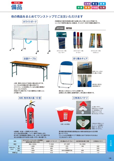 NEW備品北海道東北関東中部関西中四国九州他の商品をまとめてワンストップでご注文いただけますホワイトボード片面無地/片面月日程表仕様で必要に応じて使い分けが可能です。シンプルで場所を選ばない回転式、キャスター付きで移動も簡単です。OPTION販売品ホワイトボード用イレーザーホワイトボード用マーカーホワイトボード用マグネット会議テーブル折り畳みチェア人数・目的に合わせて自在に組み合わせでき、シンプルな木目調の折り畳み式机です。スライドレールを使用しているため脚の開閉がスムーズにできます。天板の下に棚が付いており書類などを置くことが可能です。使用しないときは折り畳んで収納整列時に便利な連結樹脂付き使わないときはコンパクトに収納でき、必要なときに簡単に設置可能で、持ち運びが簡単です。ABC粉末消火器10型三角消火バケツより扱いやすく改良されたフタ形状※ご使用時はフタ本体からフックを取り外さないで下さい三角なので倒れにくくコーナーへの設置に最適です。場内でも邪魔になりません。材質:ABS樹脂A(普通)・B(油)・C(電気)火災に対応。ガスと消火剤を内蔵し、レバー操作で放出します。圧力計で状態確認が簡単にでき、少ない力で操作できるため年配の方や女性にも使いやすい消火器です。東京都災害対策普及指導品及び消防法認定品の火災対策用バケツです。7リットルの大容量タイプで数回に分けて水をかけられるよう工夫されています。品名型式ホワイトボードキャスター付き両面(無地/日程)1800×900BBJ-1222A外形寸法(mm)幅長さ高さ質量(kg)1,8955501,80015.5会議テーブチーク折り畳みチェアブルーABC粉末消火器10型三角消火バケツT-18451,80045070013.5CF-100T370370424※座面部寸法4.4YA-10NX180-4905.1-3422203551.3138