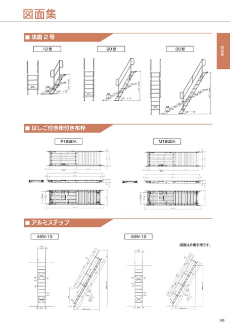 図面集図面集1901077〜2968834〜2299470〜1295■はしご付き床付き布枠F1850AM1850A■法面2号12型20型30型■アルミステップASW-13ASW-12図面は片側手摺です。