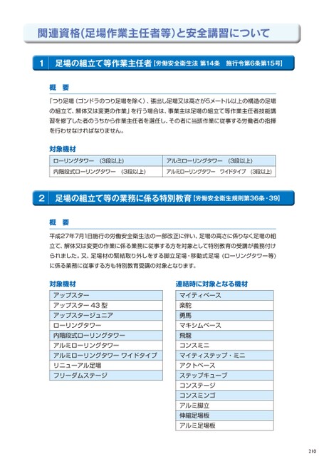 関連資格(足場作業主任者等)と安全講習について1I足場の組立て等作業主任者【労働安全衛生法第14条施行令第6条第15号】概要「つり足場(ゴンドラのつり足場を除く)、張出し足場又は高さが5メートル以上の構造の足場の組立て、解体又は変更の作業」を行う場合は、事業主は足場の組立て等作業主任者技能講習を修了した者のうちから作業主任者を選任し、その者に当該作業に従事する労働者の指揮を行わせなければなりません。対象機材ローリングタワー(3段以上)アルミローリングタワー(3段以上)内階段式ローリングタワー(3段以上)アルミローリングタワーワイドタイプ(3段以上)2I足場の組立て等の業務に係る特別教育【労働安全衛生規則第36条‐39】概要平成27年7月1日施行の労働安全衛生法の一部改正に伴い、足場の高さに係りなく足場の組立て、解体又は変更の作業に係る業務に従事する方を対象として特別教育の受講が義務付けられました。又、足場材の緊結取り外しをする脚立足場・移動式足場(ローリングタワー等)に係る業務に従事する方も特別教育受講の対象となります。対象機材連結時に対象となる機材アップスターアップスター43型アップスタージュニアローリングタワー内階段式ローリングタワーアルミローリングタワーアルミローリングタワーワイドタイプリニューアル足場フリーダムステージマイティベース楽駝勇馬マキシムベース飛龍コンスミニマイティステップ・ミニアクトベースステップキューブコンステージコンスミンゴアルミ脚立伸縮足場板アルミ足場板210