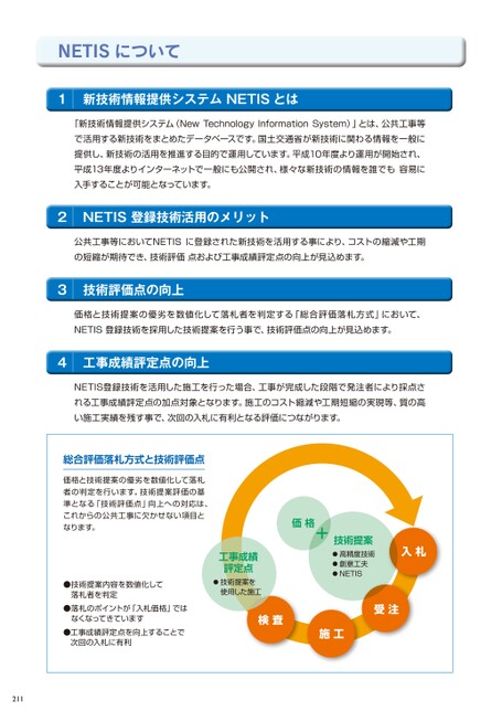 NETISについて1I新技術情報提供システムNETISとは「新技術情報提供システム(NewTechnologyInformationSystem)」とは、公共工事等で活用する新技術をまとめたデータベースです。国土交通省が新技術に関わる情報を一般に提供し、新技術の活用を推進する目的で運用しています。平成10年度より運用が開始され、平成13年度よりインターネットで一般にも公開され、様々な新技術の情報を誰でも容易に入手することが可能となっています。2INETIS登録技術活用のメリット公共工事等においてNETISに登録された新技術を活用する事により、コストの縮減や工期の短縮が期待でき、技術評価点および工事成績評定点の向上が見込めます。3I技術評価点の向上価格と技術提案の優劣を数値化して落札者を判定する「総合評価落札方式」において、NETIS登録技術を採用した技術提案を行う事で、技術評価点の向上が見込めます。4I工事成績評定点の向上NETIS登録技術を活用した施工を行った場合、工事が完成した段階で発注者により採点される工事成績評定点の加点対象となります。施工のコスト縮減や工期短縮の実現等、質の高い施工実績を残す事で、次回の入札に有利となる評価につながります。総合評価落札方式と技術評価点価格と技術提案の優劣を数値化して落札者の判定を行います。技術提案評価の基準となる「技術評価点」向上への対応は、これからの公共工事に欠かせない項目となります。●技術提案内容を数値化して落札者を判定●落札のポイントが「入札価格」ではなくなってきています●工事成績評定点を向上することで次回の入札に有利価格+技術提案●高精度技術●創意工夫●NETIS入札工事成績評定点●技術提案を使用した施工検査施工受注211