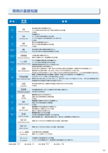ある方向に向かう光の強さのこと。ランプが発するある方向に向かう単位立体角当りの光の量。SⅠ単位。光の量のこと。ランプが発する単位時間当りの光の量。ランプから放射される光の量を表すときに使われる。SⅠ単位。照らされた面の明るさのこと。照らされた面の単位面積当りの光の量。SⅠ単位。ある方向から見た光源の光の強さのこと。ある方向に進む光に垂直な単位面積当りの光度。人の目に感じる明るさのこと。物体から発散される、単位面積当りの光の量。ランプが消費する電力当りの光の量のこと。ランプから発する単位電力当りの光の量。照明器具の経済性を考えるひとつの目安になる。自然光の色を表すための尺度のこと。ある光と等しい色度を持つ、黒体(受けた光を完全に吸収する仮想物体)の温度をその光の色温度という。数値が低いほど黄みを帯び、高くなるにつれ白→さわやかな青みがかった色になる。光の色にはLEDの出す色やフィルターを使って作られた自然光以外の色があるが、これらの色は色温度では表せない。照明による物体の色の見え方と基準光(自然光)で見たときとの色があっている程度のこと。8つのカラーチャートを使ってその差を平均化したもの。基準光と同じ見え方をしたときを100として、差が大きくなるにつれて値は小さくなる。100に近い程演色性が高い。色温度差のある光源間でRa値のみの比較はできない。球の半径の自乗に等しい面積が作る球面上の部分の中心に対する立体角。SⅠ単位。光が空間の各方向へどのくらい配光されるかを表した線のこと。光の強さの分布を表す。電気を押し出そうとする力のこと。回路に流れる単位時間当りの電流の量。SⅠ単位。電気器具に仕事をさせるもととなる量のこと。回路に流れる単位時間当りの電気量。SⅠ単位。電気器具ができる仕事の大きさを表すこと。単位時間当りに消費するエネルギの量。電圧(V)×電流(A)で計算できる。電気器具が使ったエネルギの量。ある電力の電気機器を何時間使ったかを表す量。電気の使用量に使い、電気料金の算定に使う。電力(W)×使用時間(H)で計算できる。時間に対してその大きさが周期的に変化する電流、電圧の総称。時間に対してその大きさが変化しない電流、電圧の総称。交流の電圧を変える電気機器。巻線トランスと電子トランスがある。交流電源から直流電源を作り出す装置。コンセントは交流電源なので、直流電源が必要な機器のために使用する。うど度光こluminousintensityうそく束光こluminousfluxょうど度照しilluminanceど度輝きluminanceうそくはっさんど束発散度光こluminousexitanceこうりつランプ効率luminousefficacyofalampろおんど温度色いcolortemperatureへいきんえんしょくひょうかすう平均演色評価数colorrenderingindexったいかく体角立りsteradianはいこうきょくせん配光曲線distributioncurveofluminousintensityんあつ圧電でvoltageでんりゅう電流electriccurrentでんりょく電力electricpowerでんりょくりょう電力量electricenergyうりゅう(エーシー)流(AC)交こalternatingcurrentちょくりゅう(ディーシー)直流(DC)directcurrentトランス/変圧器へんあつきtransformerCアダプタACadapterーシーAエカンデラcdルーメンlmクスxlルカンデラ毎平方メートルcd/㎡ルーメン毎平方メートルm/㎡lルーメンパーワットm/WlケルビンKアールエーRaステラジアンsr-ボルトVアンペアAットWワワット時(ワットアワー)Wh----※単位立体角:1sr1ステラジアン単位時間:1s1秒単位面積:1㎡1平方メートル単位電力:1W1ワット212照明の基礎知識単位I用語(英語表記)I説明
