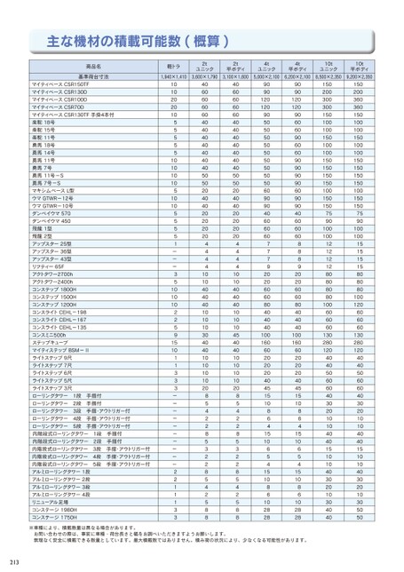 主な機材の積載可能数(概算)商品名基準荷台寸法軽トラ2tユニック2t平ボディ4tユニック4t平ボディ10tユニック10t平ボディ1,940×1,4103,600×1,7903,100×1,6005,000×2,1006,200×2,1008,500×2,3509,200×2,350マイティベースCSR150TFマイティベースCSR130DマイティベースCSR100DマイティベースCSR70DマイティベースCSR130TF手掛4本付楽駝18号楽駝15号楽駝11号勇馬18号勇馬14号勇馬11号勇馬7号勇馬11号-S勇馬7号-SマキシムベースL型ウマGTWR-12号ウマGTWR-10号ダンペイウマ570ダンペイウマ450飛龍1型飛龍2型アップスター25型アップスター36型アップスター43型リフティー65Fアクトタワー2700hアクトタワー2400hコンステップ1800Hコンステップ1500Hコンステップ1200HコンスライトCEHL-198コンスライトCEHL-167コンスライトCEHL-135コンスミニ500hステップキューブマイティステップBSM-Ⅱライトステップ9尺ライトステップ7尺ライトステップ6尺ライトステップ5尺ライトステップ3尺ローリングタワー1段手摺付ローリングタワー2段手摺付ローリングタワー3段手摺・アウトリガー付ローリングタワー4段手摺・アウトリガー付ローリングタワー5段手摺・アウトリガー付内階段式ローリングタワー1段手摺付内階段式ローリングタワー2段手摺付内階段式ローリングタワー3段手摺・アウトリガー付内階段式ローリングタワー4段手摺・アウトリガー付内階段式ローリングタワー5段手摺・アウトリガー付アルミローリングタワー1段アルミローリングタワー2段アルミローリングタワー3段アルミローリングタワー4段リニューアル足場コンステージ1980Hコンステージ1750H101020201055555101010105101055551---351010102259151011333----------22111334060606060404040404040405050204040202020204444101040404010101030404010101010208542285322854258840606060604040404040404050502040402020202044441010404040101010454040101010102085422853228542588909012012090505050505050505050609090406060607779202060608040404010016060202020404515108641510654151086102828909012012090606090606090909090609090406060608889202060608040404010016060202020404515108641510654151086102828150200300300150100100150100100150150150150100150150759010010012121212808080801006060601302801204040506060403020101040401510104030201030404015020036036015010010015010010015015015015010015015075901001001515151580808010012060606013028012040405060604030201010404015101040302010305050※車種により、積載数量は異なる場合があります。お問い合わせの際は、事前に車種・荷台長さと幅をお調べいただきますようお願いします。無理なく安全に積載できる数量としています。最大積載数ではありません。積み荷の状況により、少なくなる可能性があります。213