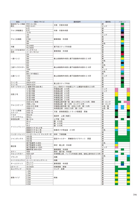 商品階段用アルミ伸縮脚立アルミ伸縮脚立アルミ足場板天龍はしご付き床付き布枠一連ハシゴ二連アップスライダー三連ハシゴ2レン太3レン太ラダーブラケット法面2号アルミステップトラック昇降ステップナカオトラックライム多目的台車メッシュパレットハンガーパレットジャンボックス棚足場タナーアルミリヤカープラシキスーパーストロングマットオーエスマットLBマットねじクランプ単管パイプ型式/サイズRYE1.0-18ARYE1.0-216尺8尺10尺1M2M2.5M3M4MTN-2400TN-3000インチサイズメーターサイズ2M3M4M5M6M6M8M10M6M9M(サヤ管式)10M12M14M2REN-4.5Y3REN-9.0Y2連梯子用(300角)12型本体12型手摺20型本体20型手摺30型本体30型手摺ASW-012本体手摺L-12LASW-013本体手摺K-13DXB-14DXB-18REG-MREG-L箱パネルSC-2W-1W-2脱着式フタSC-2用脱着式フタW-1用脱着式フタW-2用ハンガーパレットキャスター付200型400型500型梯子型建枠A-605梯子型建枠A-905梯子型建枠A-1205鋼製布板BKN-624本体NS8-A3P3×64×8スーパーストロングマットオレンジグリーンLB-0420NC431.0M1.5M2.0M2.5M3.0M3.5M4.0M識別箇所識別色パターン天板天面中央部天板天面中央部妻側側面中央部最下段ステップ中央部妻側側面中央部最上段踏桟中央部と最下段踏桟中央部の2カ所最上段踏桟中央部と最下段踏桟中央部の2カ所最上段踏桟中央部と最下段踏桟中央部の2カ所最上段ステップ中央はしご取付バー中央部とアーム補強中央部の2カ所手摺差込部4カ所本体差込部2カ所手摺差込部4カ所本体差込部2カ所手摺差込部4カ所本体差込部2カ所手摺差込部外側一面緑2カ所ピンク2カ所両側本体差込部緑1カ所ピンク1か所手摺差込部外側一面水色2カ所黄1カ所本体差込部水色2カ所黄1カ所天板昇降側側面とトラック側側面両端階段枠上部(端部)上下面中央脚4カ所脚4カ所脚4カ所脱着式フタ用金具2カ所床枠下部四隅固定キャスター車輪取付けブラケット両面梁材最上段中央部妻側側面中央部梁材最下段中央部本体側面上部、ハンドル中央部と前板、後板上部中央の5カ所四隅四隅妻側側面中央部桁側側面両端リング全面両端緑ピンク緑青黒ピンク黒緑黄水色黒緑緑黒赤緑黄水色黒水色黄ピンク水色緑ピンク黒緑黒緑緑ピンクピンク黄黄緑緑緑・ピンク緑・ピンク水色・黄水色・黄黒緑緑黒緑緑緑緑黄水色緑緑緑緑緑水色黄ピンク緑緑緑水色緑緑緑青緑緑緑黄緑黄緑黄緑216