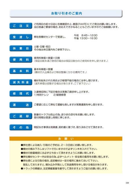 お取り引きのご案内ご注文ご利用日の前々日迄に在庫確認の上、書面(FAX可)にてご発注お願い致します。当日急遽ご要望の場合、お応えできかねることもございますのでご容赦願います。受渡し弊社各機材センターで受渡し。8:45〜12:00午前午後13:00〜16:30休業日土曜・日曜・祝日その他は休日案内をご参照下さい。使用料使用料単価×数量×日数(保証日数未満ご使用の場合は保証日数分のご使用料を申し受けます。)基本料基本料単価×数量(機材の入出庫および検収整備にかかる費用です。)滅失料金機材を紛失された時および修理不能の場合には申し受けます。(滅失単価は変動する場合があります。ご了承下さい。)修理代入庫検収時に下記の場合は実費ご請求申し上げます。1)特別ケレン2)破損修理運送ご要望に応じて弊社で運搬も致しますが実費運賃を申し受けます。ご返却数量のトラブル防止の為、送り状の添付をお願い致します。受付時間は受渡し時間に準じます。その他明記なき事項は見積書、契約書に基づき、取り決めさせて頂きます。お願い●弊社便による納入・引取のご予約は、2〜3日前にお願い致します。●機材の積み下ろしはリフトで行いますので必ずリン木を入れて下さい。●機材の数量確認には必ず立ち会って頂きますようにお願い致します。●弊社機材センター内は安全の為、必ずヘルメット・安全靴の着用をお願い致します。●弊社便による引取の場合、返却機材は一定の場所に集めておいて下さい。散乱しておりますと、積み込み手間として別途費用を申し受ける場合があります。●トラックの積載は、法定積載重量を厳守して頂きますようご協力お願い致します。220