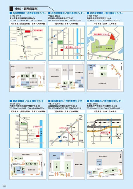 機材置場(倉庫)機材置場(倉庫)機材置場(倉庫)機材置場洗浄場事務所受付前面道路出口入口来客用駐車場置材機場営業車用駐車場※一方通行です403(磐田・掛川線)至掛川I.C静岡方面至磐田・浜松方面白鳩橋詰金沢機材センター富士見台霊園掛川墓地公園88桂南町198無量寺公園掛川機材センター中部・関西営業部■名古屋営業所/名古屋機材センター〒496-0013愛知県津島市神尾町字野中84TEL.0567-33-1221FAX.0567-33-1222■名古屋営業所/金沢機材センター〒920-0333石川県金沢市無量寺2丁目50TEL.076-267-0222FAX.076-267-0322■名古屋営業所/掛川機材センター〒436-0024静岡県掛川市南西郷1315-4TEL.0537-23-7221FAX.0537-23-7222対応業務:受発注業務出庫・入庫業務対応業務:出庫・入庫業務対応業務:出庫・入庫業務阪神西灘駅岩屋至姫路2阪神大石駅味泥大石43至大阪3至姫路摩耶出入口フェニックスプラザ阪神高速3号神線戸神戸機材センター沢の鶴資料館サンクスイスズセブンイレブンコーナンPRO出光神戸製鋼所至摩耶埠頭日本製粉大阪工場関西営業所木津川●手原産業倉庫大阪倉庫●コメック●パチンコ大正ウエスト(通り抜け不可)●大正区役所千島公園千島下水処理場●小林公園●大阪製鐵恩加島工場●千本松大橋西詰至千本松大橋●千島ガーデンモール●コーナン●洋服の青山至大正駅大正通千島北大正区役所前大正警察署前小林大正中央中学校前平尾南恩加島大運橋至新木津川大橋■関西営業所/大正機材センター〒551-0012大阪府大阪市大正区平尾1丁目4-38TEL.06-4394-6333FAX.06-4394-6334■関西営業所/枚方機材センター〒573-0004大阪府枚方市中宮大池2丁目35-1TEL.072-840-8510FAX.072-840-8512■関西営業所/神戸機材センター〒657-0852兵庫県神戸市灘区大石南町1-3-30TEL.078-802-5156FAX.078-802-1630対応業務:受発注業務出庫・入庫業務対応業務:出庫・入庫業務対応業務:出庫・入庫業務223