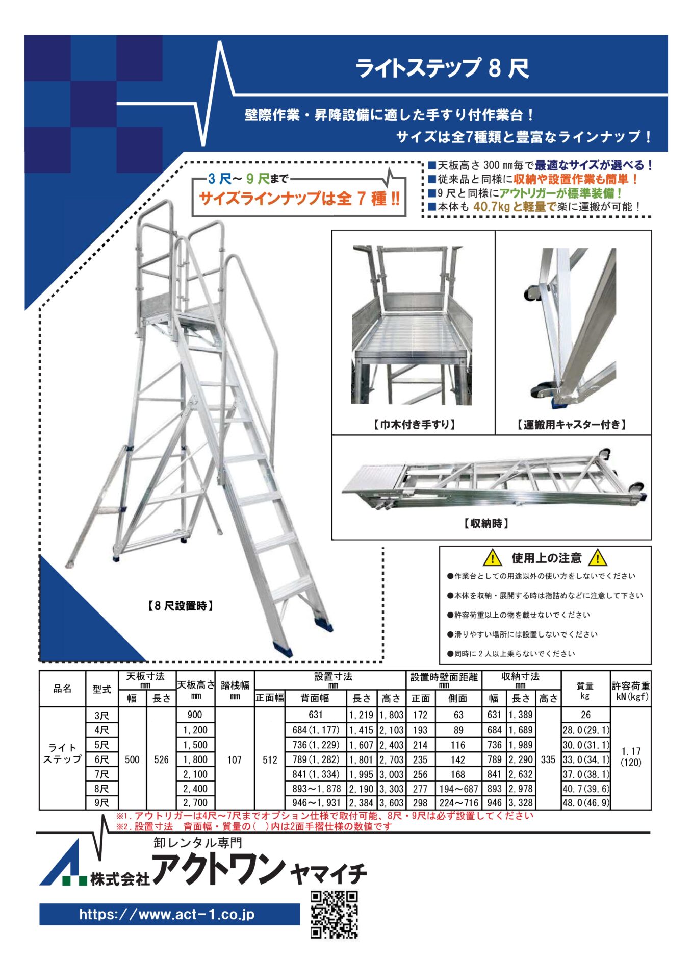 壁際の作業に、昇降設備に。手摺付多機能作業台。